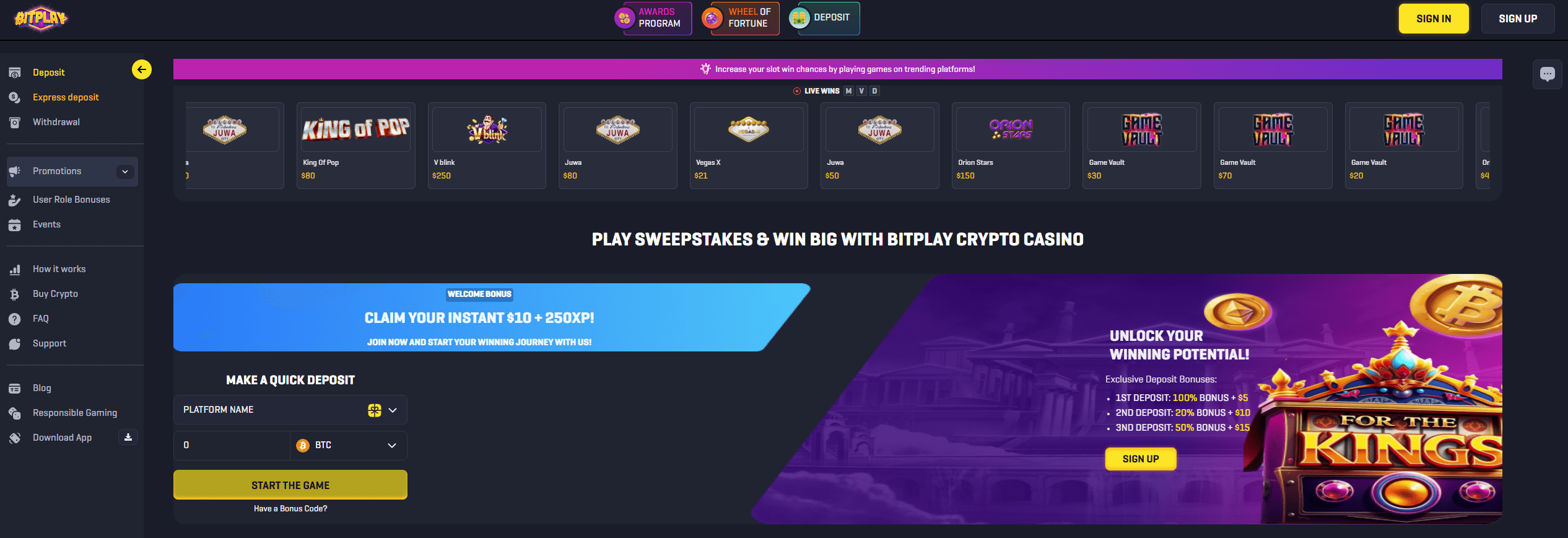 Bitplay est un choix parfait pour les joueurs qui veulent une plateforme crypto sécurisée, intuitive et généreuse, avec des bonus pensés pour maximiser le plaisir. 🚀